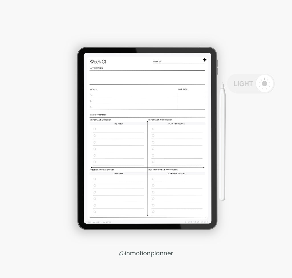 Streamline your life with the Minimalist Planner, designed for those who value flexibility, simplicity, and style. This undated weekly planner is the perfect tool to help you stay organized and on top of your schedule, whether for personal or professional use. Its clean, modern design offers the versatility you need to start planning anytime, anywhere. With just the essentials, it's a must-have for anyone looking to achieve their goals without the clutter.