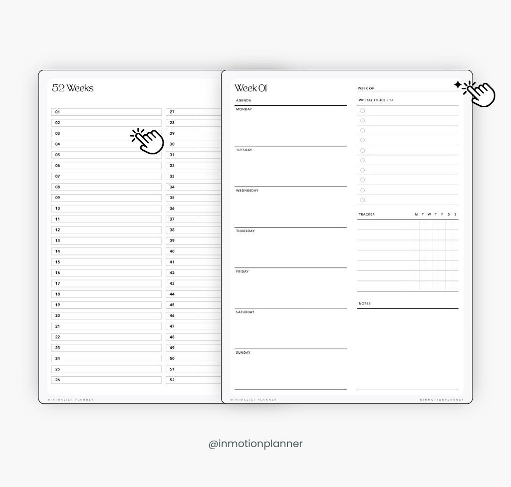 Navigate through your planner effortlessly with an index page featuring hyperlinks to each week. A simple click on the top corner of any page takes you straight back to the index, providing a smooth and intuitive planning experience. This feature allows you to retrieve your information instantly, making your organization even more efficient and effortless.