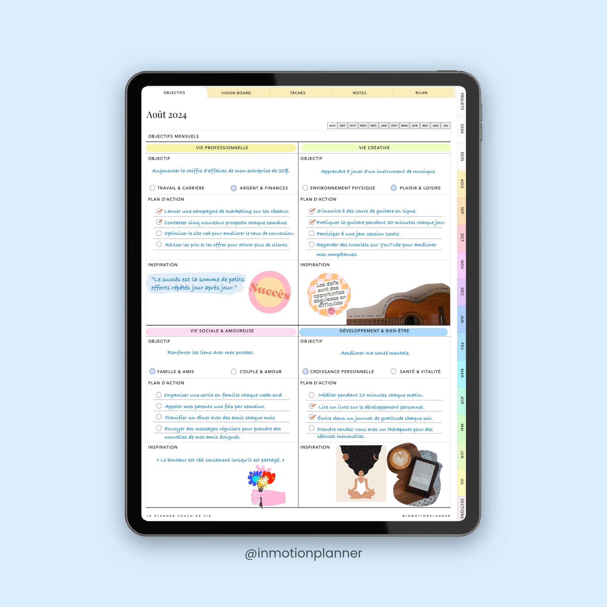 Vision Board: visualize seus objetivos e aspirações através de um quadro de visão. Ao incorporar imagens, citações e afirmações, você permanece motivado e focado durante todo o mês.